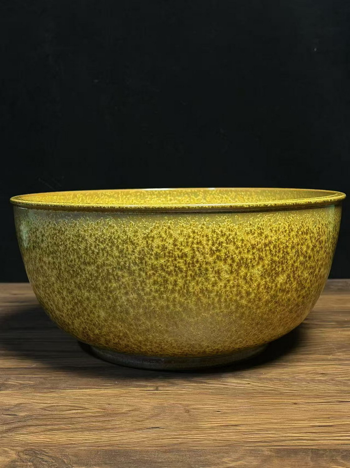、 在钧瓷的审美文化中,人们往往把窑变出的有意境的自然图画的钧瓷视为最高的美感境界之一。 钧瓷上窑变的图画,不是画家用笔和颜料画成的,而是用“火的艺术”或自然力量的偶然幻化而“烧”出来的,是钧瓷工匠们在浓重的文化熏陶下,不急不躁、不赜索隐、孜孜以求的理性创造,是天时、地利、人和的精华之气的冥然契合。它的窑变极似中国画的写意手法,在色彩的浓淡虚实之间表达一种中国古典美学的意境之美。故钧瓷上窑变出现的图画是不固定的、不是以人的意志为设定的,釉画的出现是“千年等一回”,百窑都难见的“稀奇”之物。 钧瓷有着一千多年的历史,在漫长的岁月中,真正具有自然窑变的釉画并不多,在我的记忆中,几十年间,只有几个真正可称得上是釉画的作品,《寒鸦归林》、《富士霞光》、《凤凰涅槃》这几个当之无愧。每个时代都会有不同的作品创作,都会留下时代的痕迹,有好,有次,有一般的。好的成为了经典,次的被淘汰。好的作品能引起人们的情感共鸣,能够给人带来美的享受和更强烈的快感与震撼。 豫鼎钧窑有一件由李亚洲及其儿子李京齐、李京辉烧出的取名为《漓江胜景》的钧瓷笔洗。这件钧瓷,这是桂林山水。这个笔洗,直径26厘米,高12厘米,传统造型。器型简洁干练,姿态端庄大方,线条飘逸,制作精细,通体施釉,釉施原二厂47号釉,釉色清新别致,温润如玉,以蜡黄、青翠绿为基本色泽,色泽纯净,一尘不染,且透活灵动,有玉质感。淡黄的色黄橙橙如茶,温暖芬芳;翠绿的色如碧,清澈明亮,不论什么色,都好似涂上了一层厚厚的腊月油脂,油糊糊的,润劲十足。然而就在这个圆圆的釉面上的一侧,却窑变出了由江水、红光、树木、山峰组成的山水图画。此图红中有紫、紫中有黑、黑中泛蓝、蓝中透紫、紫中禺白、白中渗绿,深浅不等,熔融渗化,绚丽多彩,浓而不溢,艳而不佻,窑变图案富有立体感和层次感。